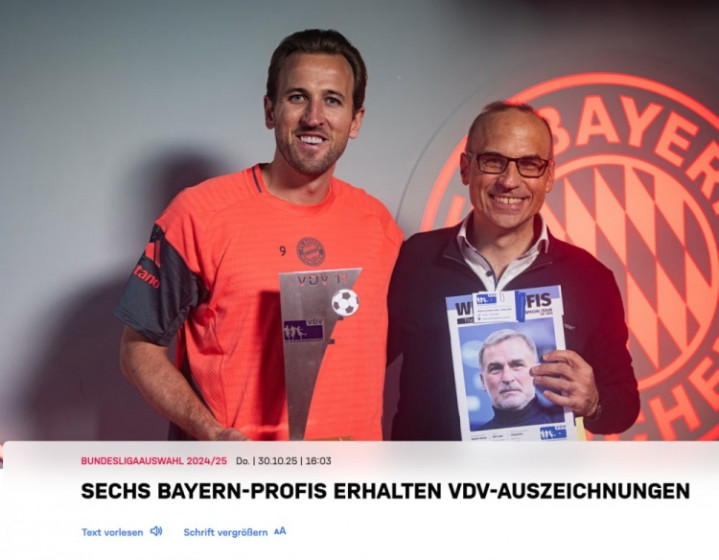 在VDV赛季最佳球员评选中,两位拜仁球员跻身三甲。哈里-凯恩(20.0%)与迈克尔-奥利塞(17.0%)仅逊于卫冕冠军弗洛里安-维尔茨(29.1%)。