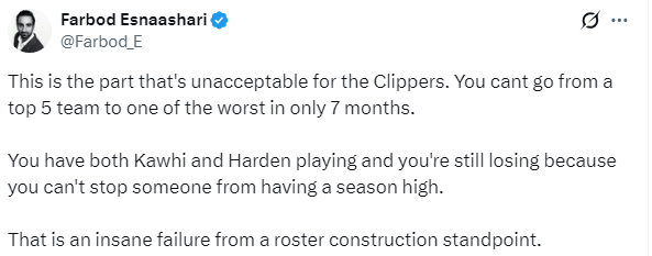 对于快船的糟糕表现,快船队记Farbod Esnaashari发推怒喷球队表现,他写道:短短七个月,快船就从联盟前五的球队沦落到垫底,这是最无法接受的一点。莱昂纳德和哈登都在队里,你们却依然输球,因为你们根本无法阻止对方有人站出来打出赛季新高。从阵容构建的角度来看,这简直是灾难性的失败。