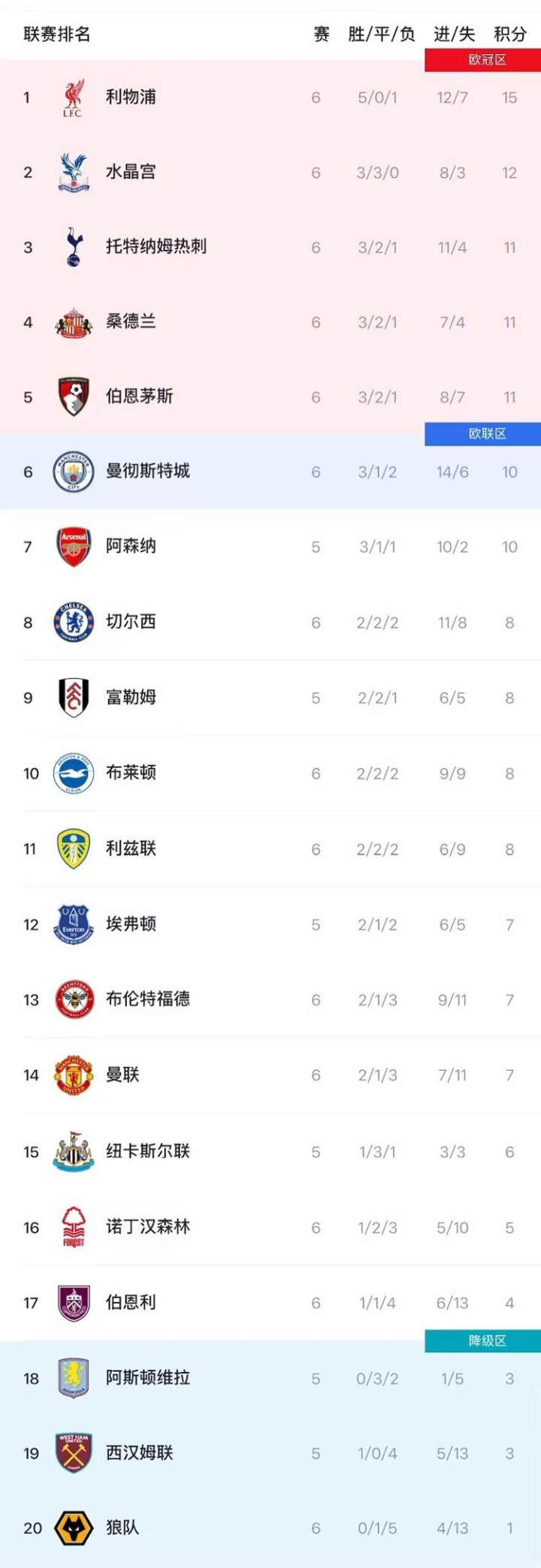 虎扑09月28日讯英超第六轮首个比赛日结束,曼联、切尔西、利物浦纷纷爆冷,热刺、伯恩茅斯上演补时绝平,曼城则大比分取胜。