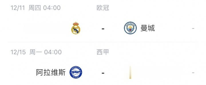 皇马将于本周中对阵曼城,下周一对阵阿拉维斯。
