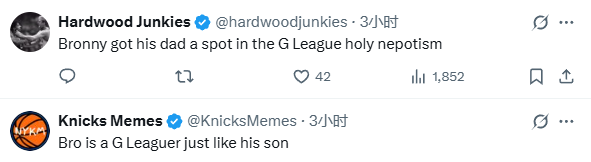 詹姆斯下放发展联盟引热议,美媒打趣:詹姆斯是发展联盟球员,布朗尼是NBA球员,GOAT正式过气了;詹姆斯能在发展联盟狂砍100分;美媒更是预测詹姆斯有99%的机会夺得G联赛MVP;美球迷纷纷调侃:布朗尼帮他爸在发展联盟弄了个位置,这简直是裙带关系!